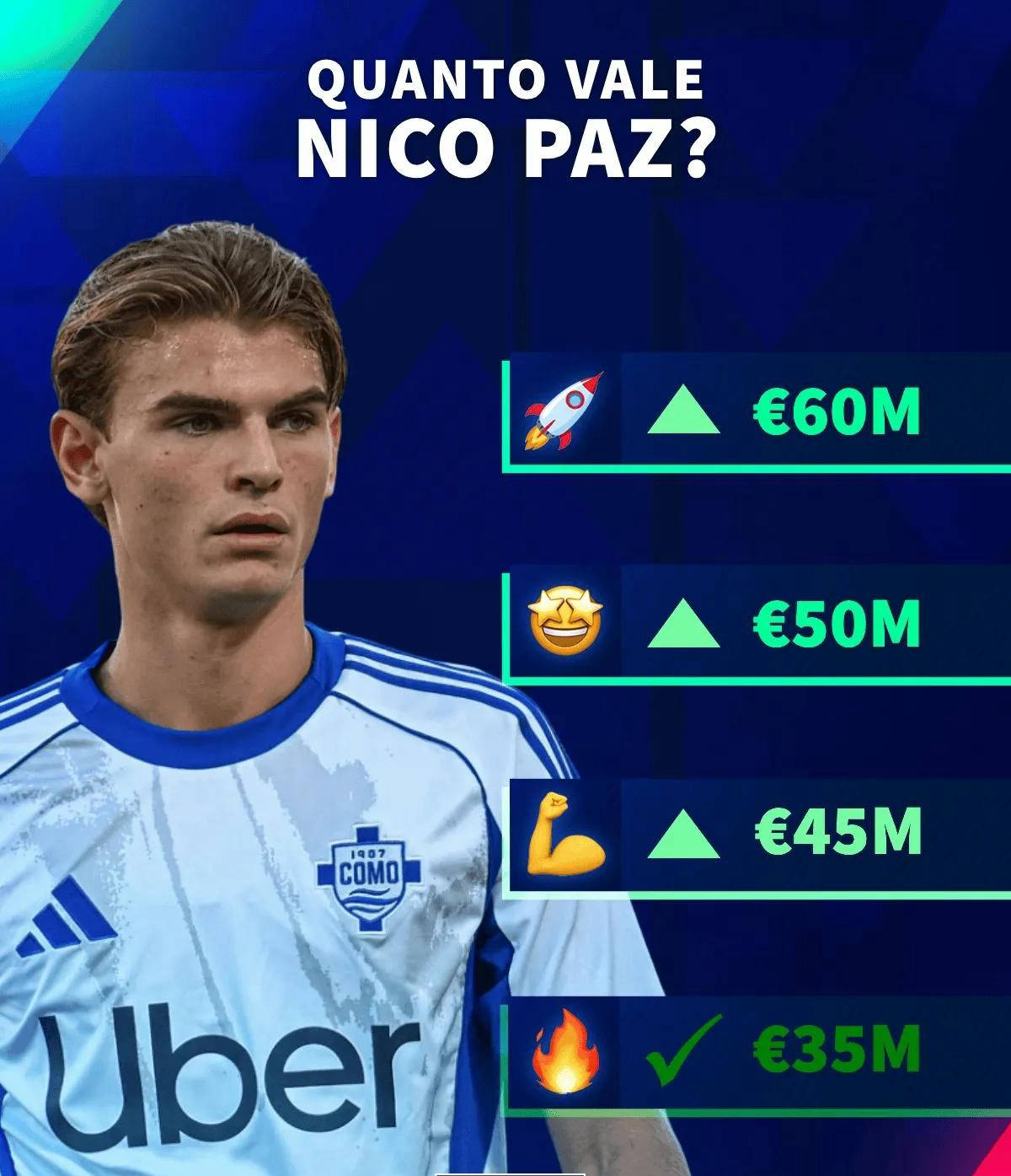德国转会市场网站最新消息显示,21岁的阿根廷小将尼科-帕斯在效力意甲科莫期间迎来身价暴涨,最高可达到6000万欧元,几乎是目前3500万的倍数。